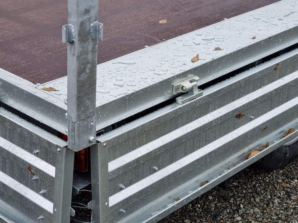 ● Откидные борта дают возможность осуществлять загрузку и выгрузку с любой стороны платформы. Они выполнены из оцинкованного стального листа (толщина 1,5 мм) с дополнительной штамповкой рёбер жёсткости. Рёбра жёсткости позволяют повысить устойчивость бортов к динамическим/ударным нагрузкам. Борта и стойки бортов — съёмные.