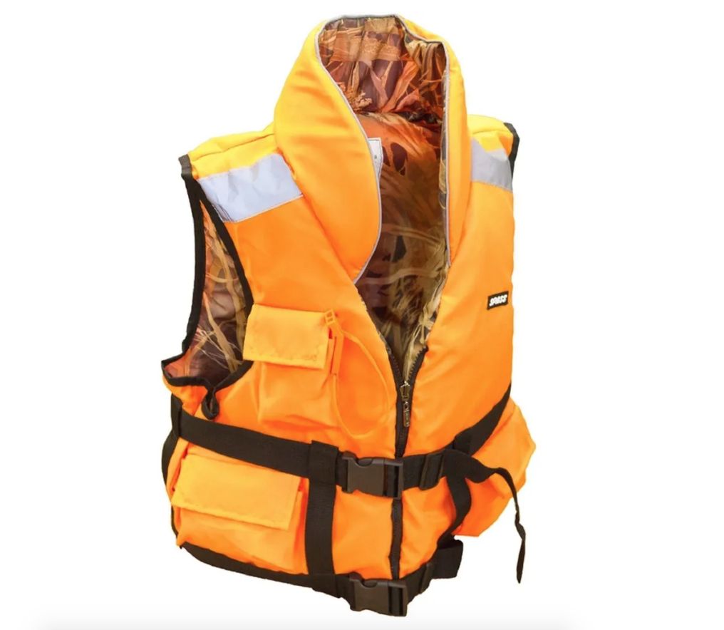 Спасательный жилет "Командор" в зависимости от размера предназначен для людей весом от 60 до 140 кг. С лицевой стороны жилет ярко оранжевый, если вывернуть в обратную сторону - камуфляжный. С яркой стороны 3 кармана - 2 внизу и 1 нагрудный со свистком, с камуфляжной стороны 2 кармана внизу. Очень удобный воротник-стойка. Отлично защищает шею от ветра и не мешает при поворотах и наклонах головы. Застегивается жилет на двусторонний замок-молнию и 2 ремня с фастексами. Для хорошей видимости в темное время суток на плечах расположены светоотражающие полосы, а верхняя кромка воротника со светоотражающим кантом. Для того, чтобы при падении в воду жилет не слетел с человека - жилет снабжен паховой стропой. Жилет предназначен для рыбалки и охоты.