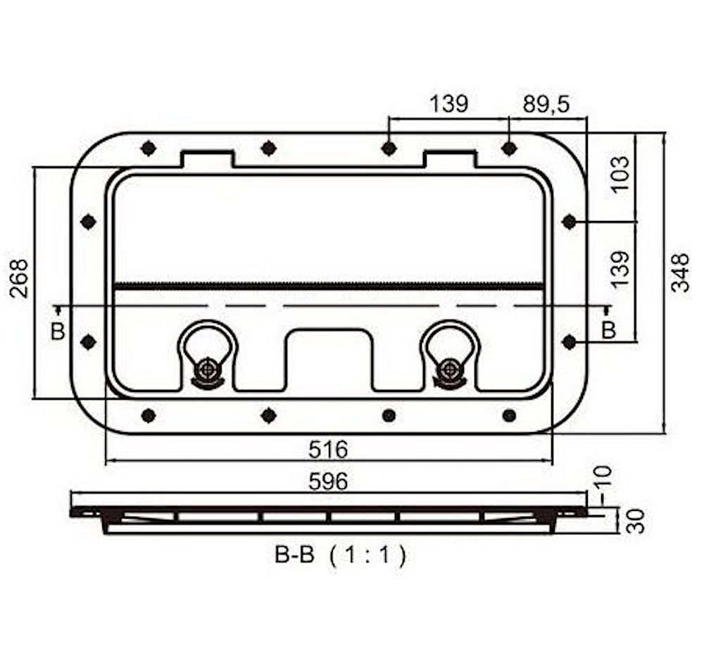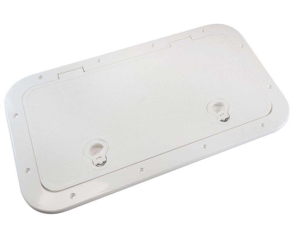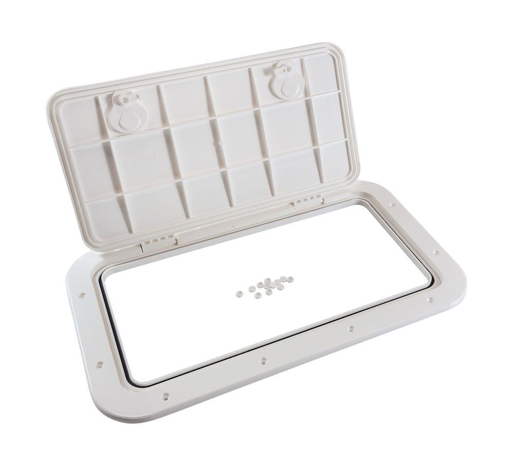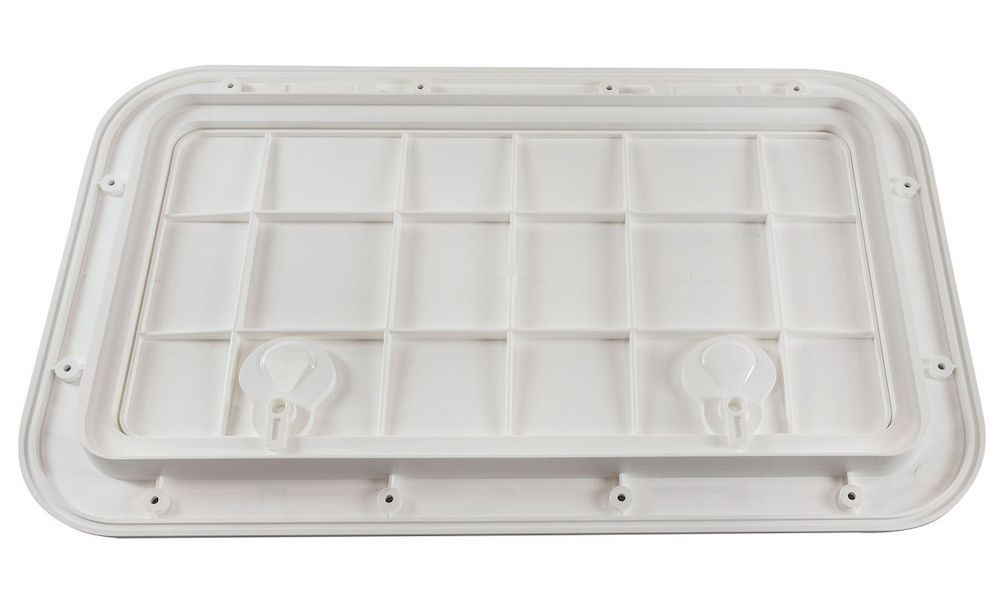 Люк инспекционный с монтажными отверстиями. Устанавливается как на горизонтальных, так и на вертикальных поверхностях. Изготовлен из пластика.