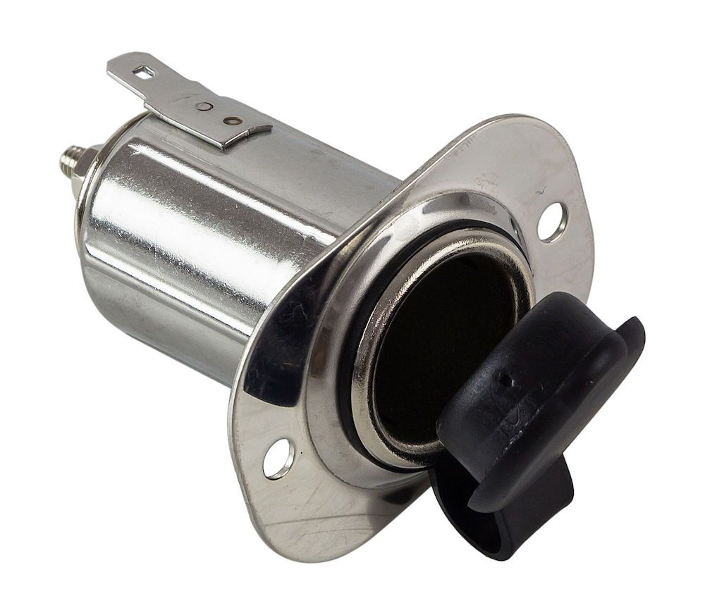 Гнездо прикуривателя из нержавеющей стали с резиновой крышкой. Может использоваться для подключения переносного электрооборудования.