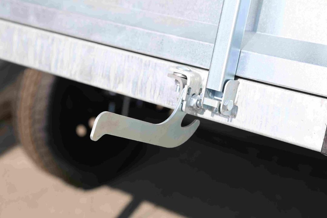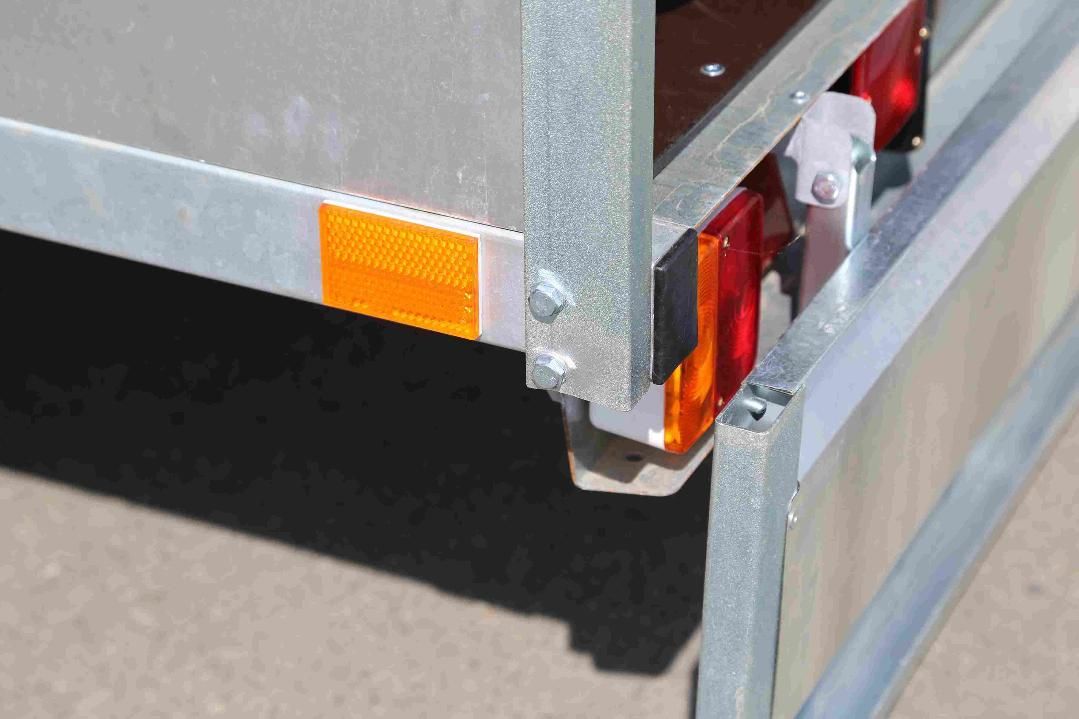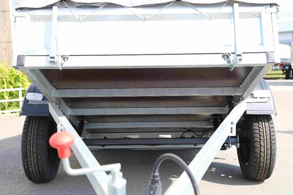 Оцинкованные рама с дышлом, днище фанерное 6 мм, борт оцинкованный высотой 300 мм, модуль подвески с колесами 13” и 4-листовой рессорой, панель световых приборов со стандартными или светодиодными фонарями, страховочная цепь. Прицеп оснащен самосвальной системой оригинальной конструкции.