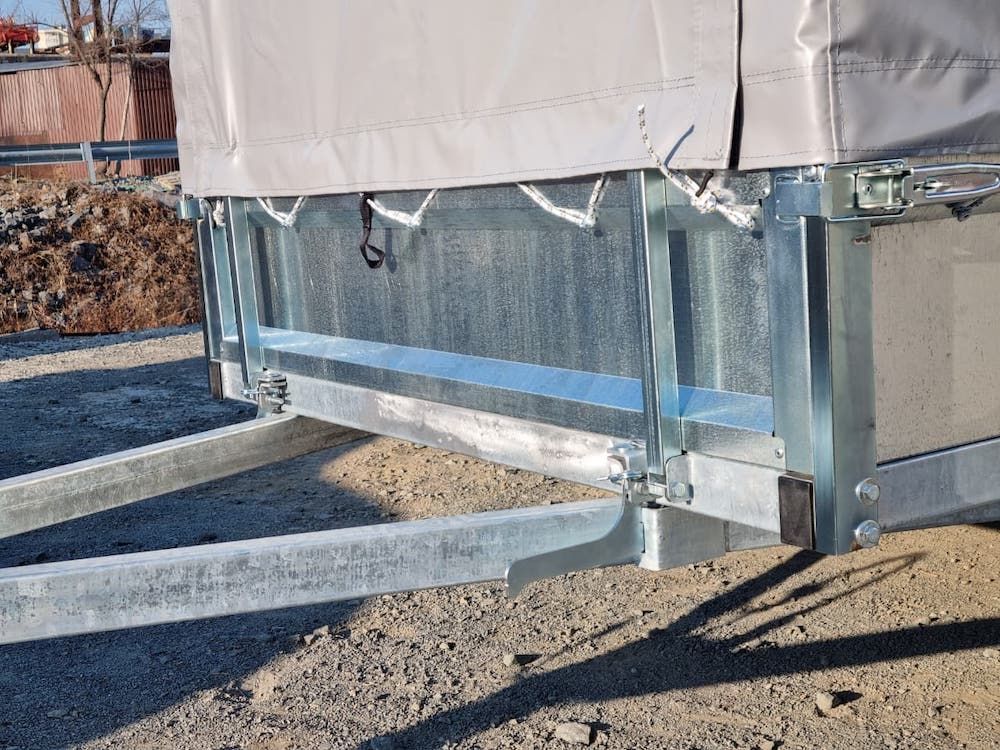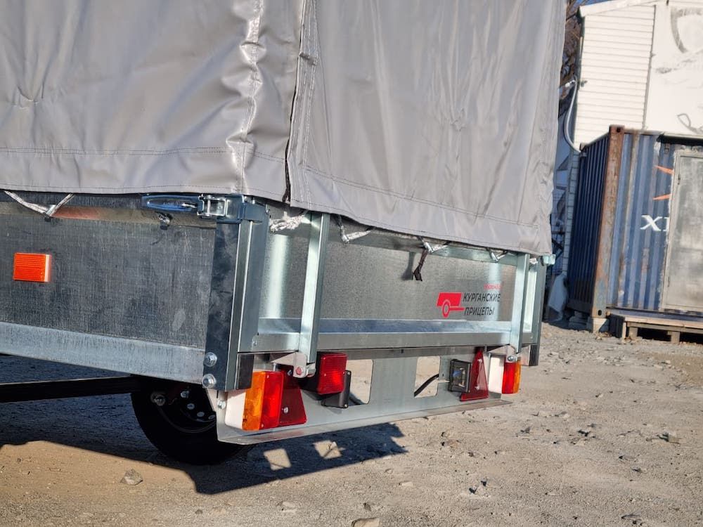 Тент и дуги. Для защиты груза от атмосферных осадков и дорожной грязи на прицеп установлен комплект дуг и тент. высотой 0,75 метра от верхней кромки борта. Высокий тент имеет передний и задний клапан на молнии и липучке (защита замка от грязи). Для удобного доступа внутрь кузова, клапан сворачивается и фиксируется сверху липкой лентой.
